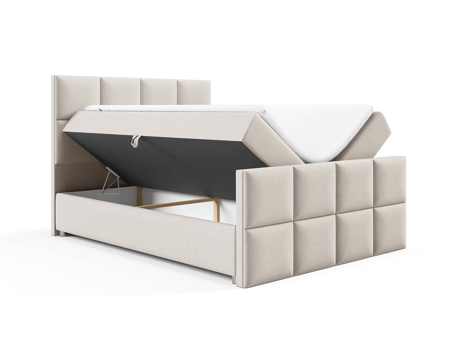 Konstrukcja tego dwuosobowego łóżka opiera się na solidnej podstawie z pojemnikami na pościel – sprytne rozwiązanie dla tych, którzy chcą utrzymać w sypialni ład i zyskać dodatkową przestrzeń do przechowywania różnego rodzaju przedmiotów. Oba schowki otwierane są za pomocą podnośników sprężynowych, co czyni ich użytkowanie prostym i wygodnym nawet na co dzień.