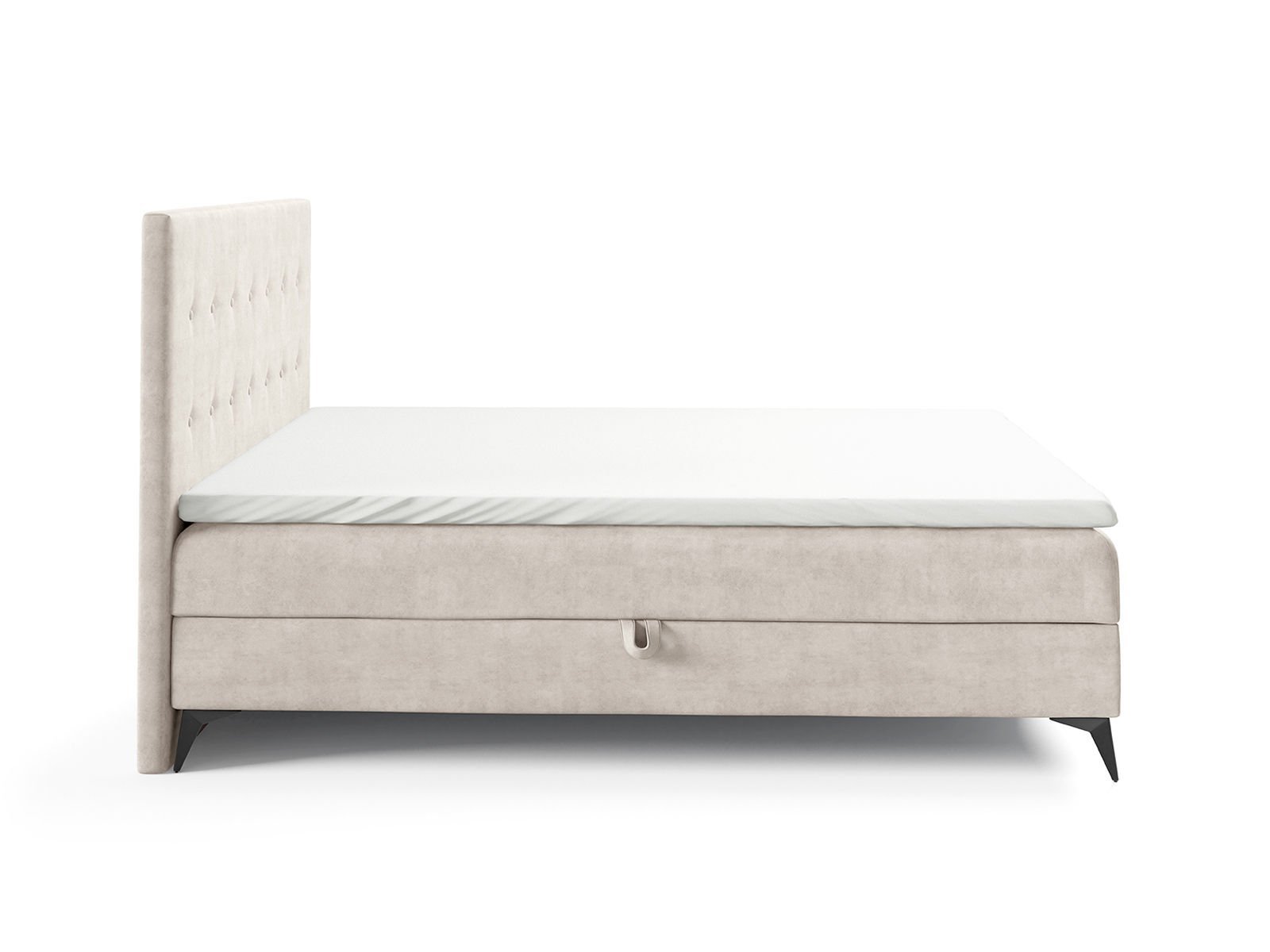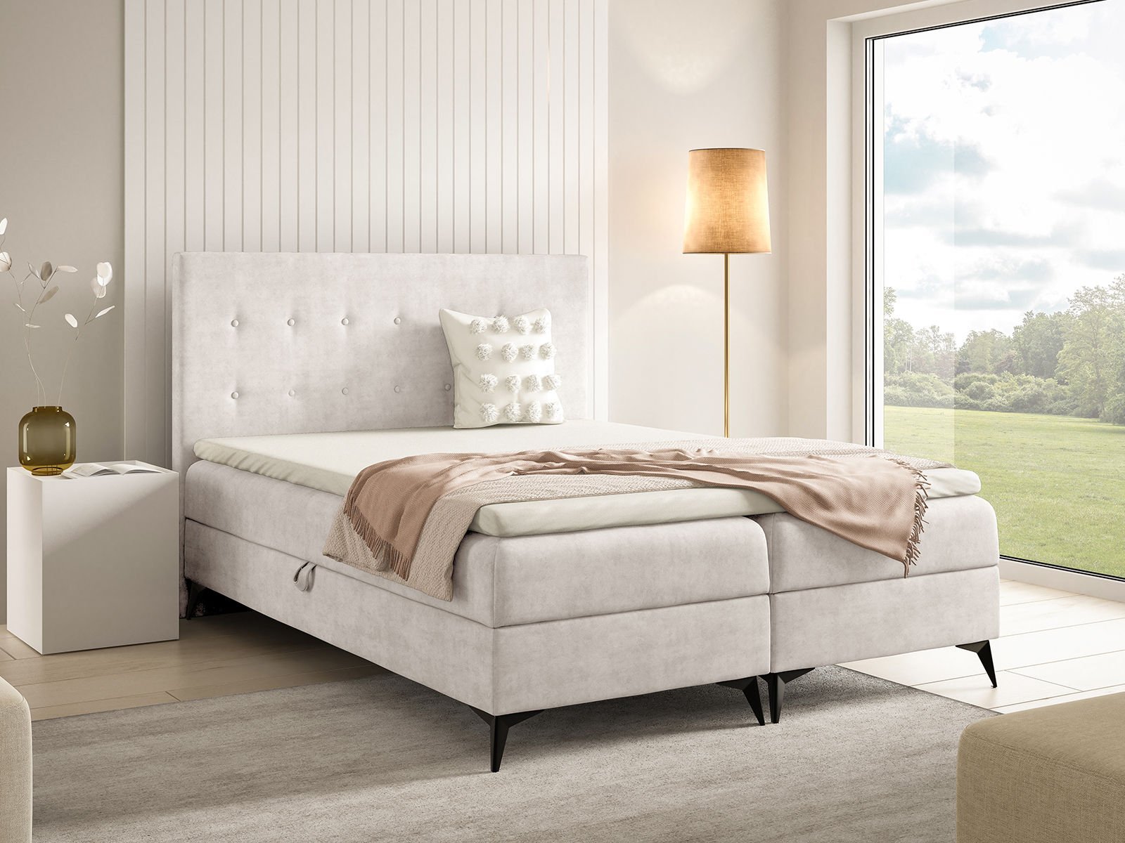 Smukła forma łóżka w połączeniu z czarnymi, metalowymi nogami nadaje całości lekkości i nowoczesnego charakteru. Dzięki temu łóżko na metalowych nogach nie przytłacza przestrzeni i świetnie odnajduje się zarówno w większych sypialniach, jak i bardziej kompaktowych pomieszczeniach. Stabilna konstrukcja gwarantuje trwałość oraz bezpieczeństwo użytkowania przez długi czas.