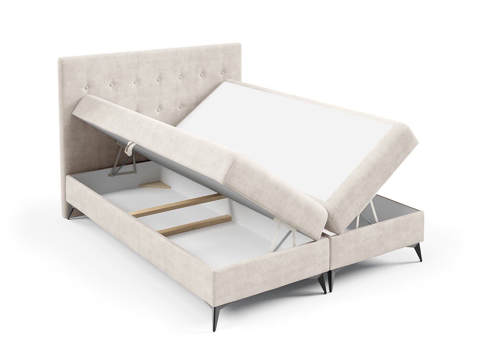 Praktyczne pojemniki na pościel Łóżko K-15 SLIM wyposażono w dwa pojemne schowki na pościel, które są łatwo dostępne dzięki podnośnikom sprężynowym. Te praktyczne rozwiązania umożliwiają przechowywanie dodatkowych kołder, poduszek i innych niezbędnych przedmiotów, utrzymując sypialnię w porządku. Przestrzeń pod materacem jest maksymalnie wykorzystana, co pozwala zaoszczędzić miejsce w pomieszczeniu.