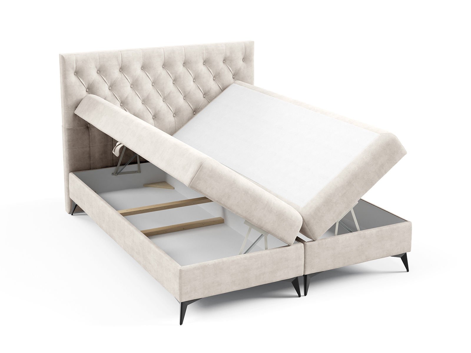 Solidna podstawa Każda baza łóżka jest wykonana z białej laminowanej płyty o grubości 16 mm i wyposażona w pojemny schowek na pościel, co umożliwia wygodne przechowywanie.