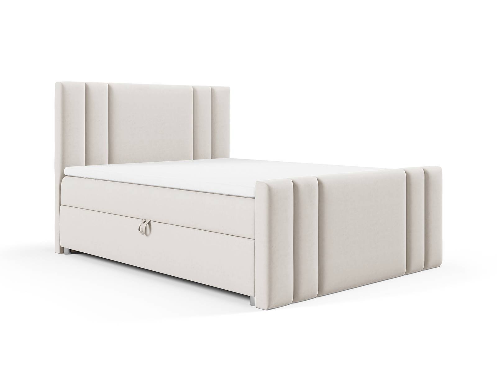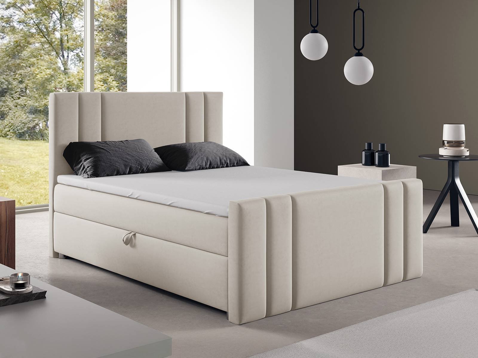 Zanurz się w luksusie z przestronnym łóżkiem małżeńskim 200×200, oferującym imponującą powierzchnię spania bez kompromisów. Wysoki zagłówek wraz z tapicerowanym frontem łóżka charakteryzują się estetycznymi przeszyciami oraz dodają wnętrzu elegancji i zapewniają wygodę podczas relaksu. Dwuosobowe łóżko kontynentalne z przodkiem K-8 zawiera dwa duże schowki na pościel, które są szybko i łatwo dostępne dzięki sprężynowym podnośnikom.