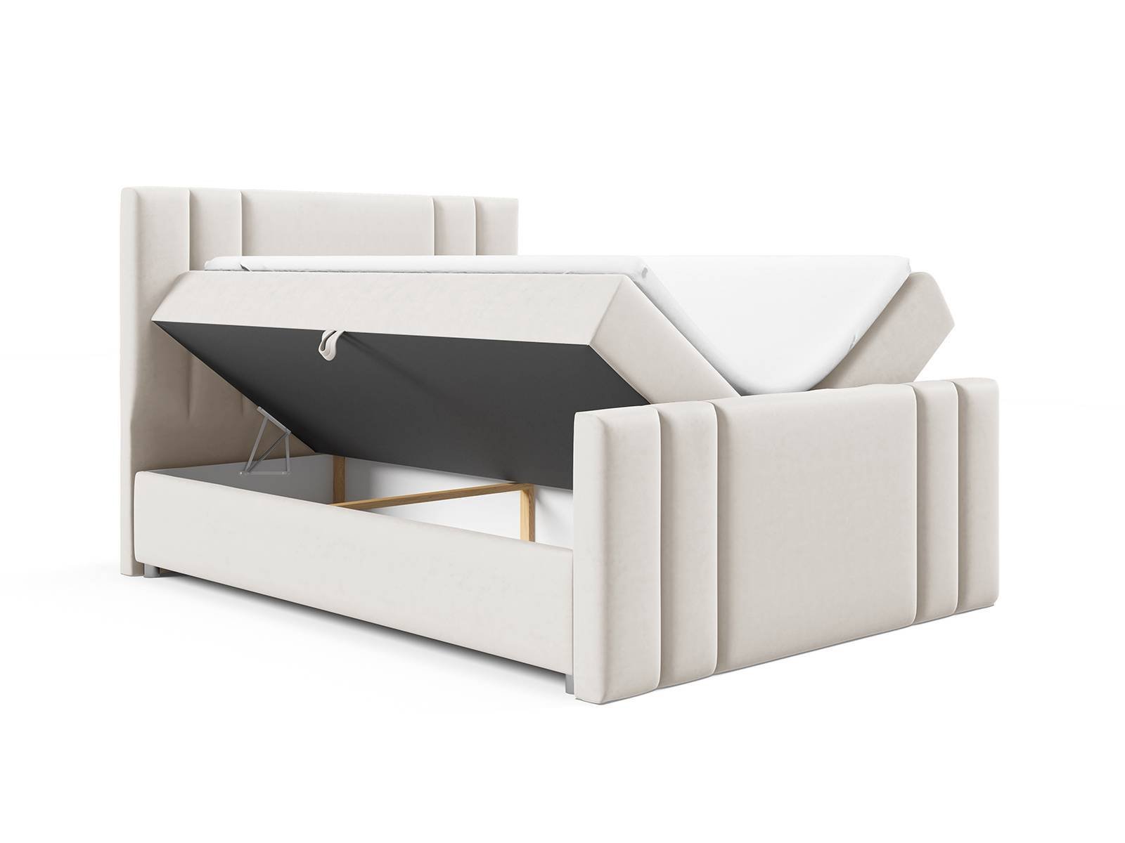 Podstawa łóżka kryje dwa schowki na pościel, otwierane płynnie, cicho i lekko dzięki sprężynowym podnośnikom. Ich ukryta przestrzeń pomieści koce, poduszki czy sezonowe ubrania, pomagając utrzymać porządek i optymalnie wykorzystać dostępną powierzchnię.