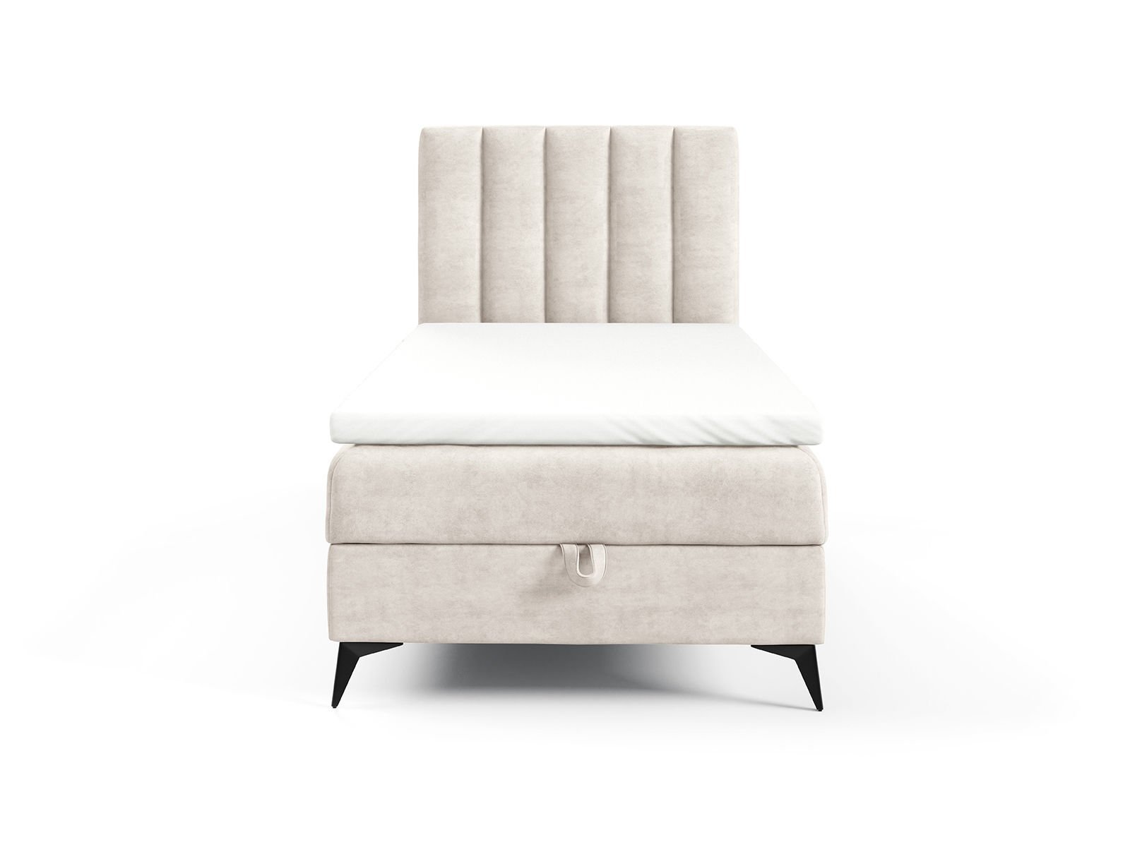 Nowoczesne łóżko tapicerowane 80x200 łączy wygodę snu z lekką, stylową formą. Pionowe przeszycia na zagłówku nadają mu eleganckiego wyglądu i podkreślają staranne wykończenie. Konstrukcja osadzona na cienkich, czarnych metalowych nogach dodaje bryle wizualnej lekkości. Dodatkowy schowek pod materacem pozwala wygodnie przechowywać pościel i inne tekstylia.