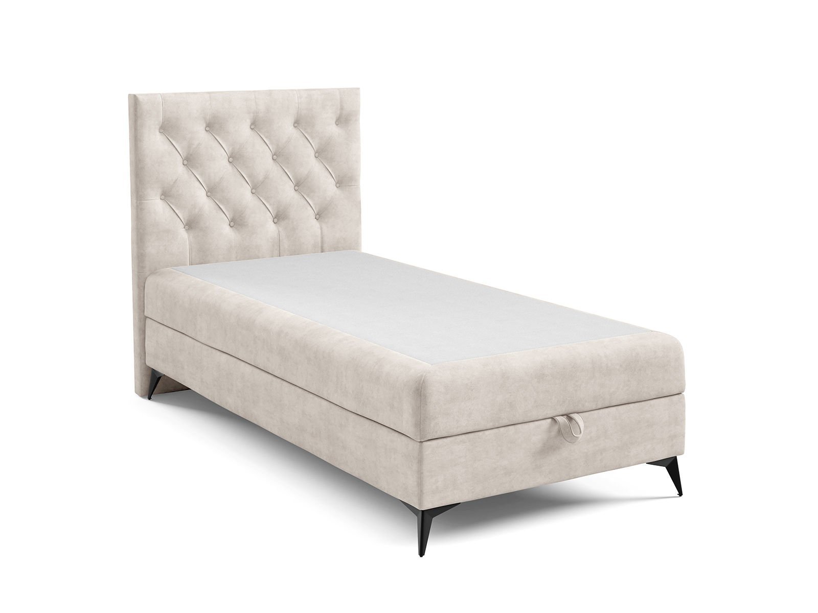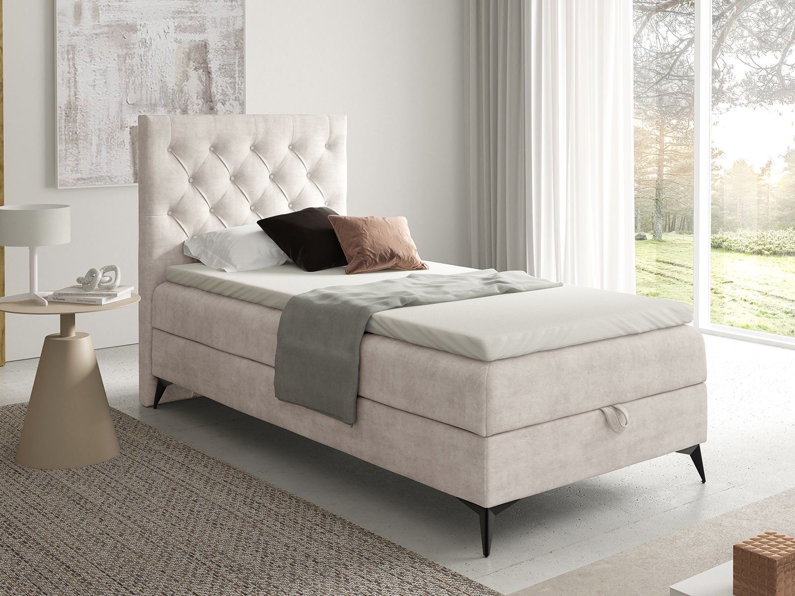Łóżko kontynentalne z czarnymi nogami 90x200 to przestronne łóżko młodzieżowe, które zapewnia wysoki komfort snu oraz dużą swobodę wypoczynku. Szerokość 90 cm sprawia, że jest to jeden z najczęściej wybieranych rozmiarów – idealny zarówno do sypialni domowej, jak i do pokoi hotelowych, pensjonatów czy apartamentów. Eleganckie, pikowane wezgłowie nadaje wnętrzu stylowego charakteru i stanowi wygodne oparcie podczas czytania, oglądania telewizji czy pracy z laptopem.