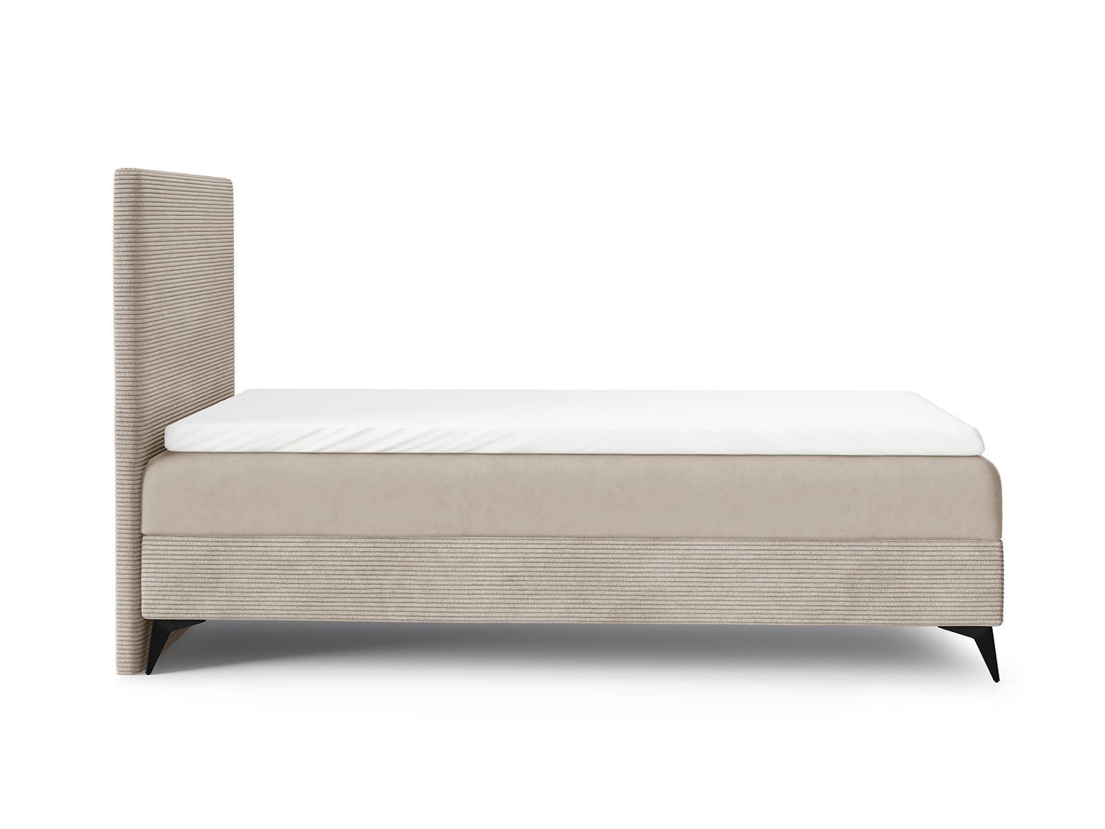 Szerokość łóżka 90 cm zapewnia większą swobodę użytkowania, dlatego model dobrze sprawdza się zarówno w pokoju młodzieżowym, jak i w sypialni przeznaczonej dla jednej osoby. Smukła podstawa osadzona na czarnych podporach sprawia, że łóżko na metalowych nogach nie przytłacza wnętrza i zachowuje lekką linię. To rozwiązanie, które dobrze odnajduje się w nowoczesnych aranżacjach.