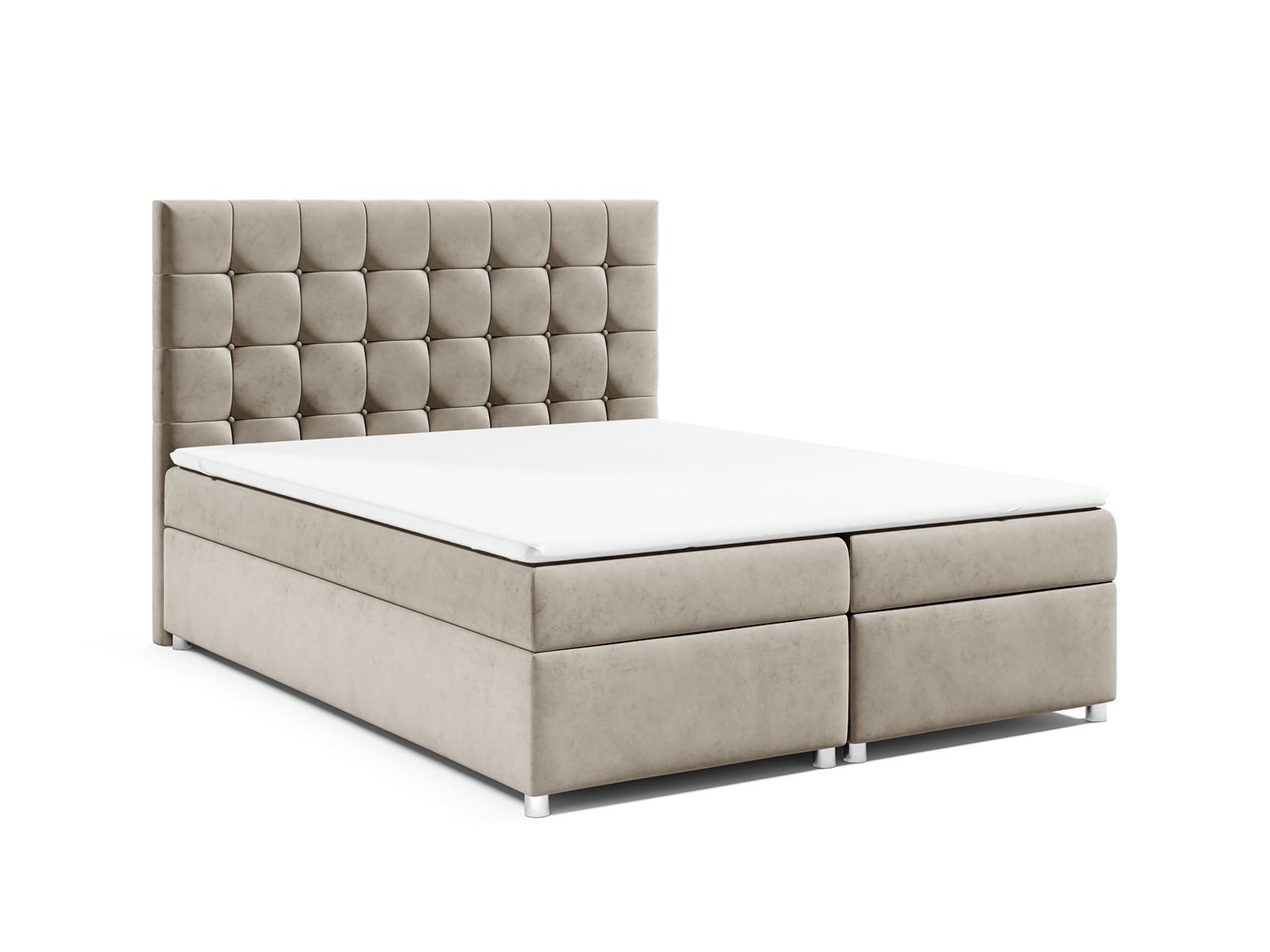 Komfortowy materac Wbudowany materac wykonany z pianki T25 o wysokości 14 cm z wkładem ze sprężyn bonellowych zapewnia odpowiednie podparcie i komfort snu. Łóżko tapicerowane nie zawiera prezentowanego na zdjęciach materaca nawierzchniowego (topper), ten można zakupić dodatkowo w kategorii materace lub w zestawie łóżka kontynentalne z materacem nawierzchniowym.