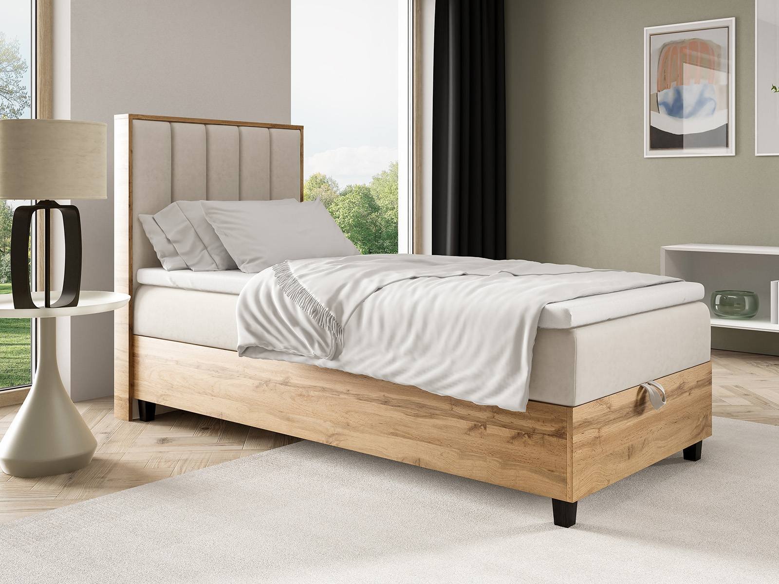 Pojedyncze łóżko kontynentalne z płytą laminowaną dąb wotan K-10 w zestawie z materacem nawierzchniowym 100x200 – Łóżko kontynentalne z zagłowiem to doskonały wybór, bardzo dobrze sprawdzający się w stylowej sypialni. W zestawie z wysokiej jakości topperem, który zapewnia optymalny komfort snu. Tapicerka w eleganckim wykończeniu doskonale wpisuje się w różnorodne aranżacje, a solidna konstrukcja gwarantuje trwałość na lata.