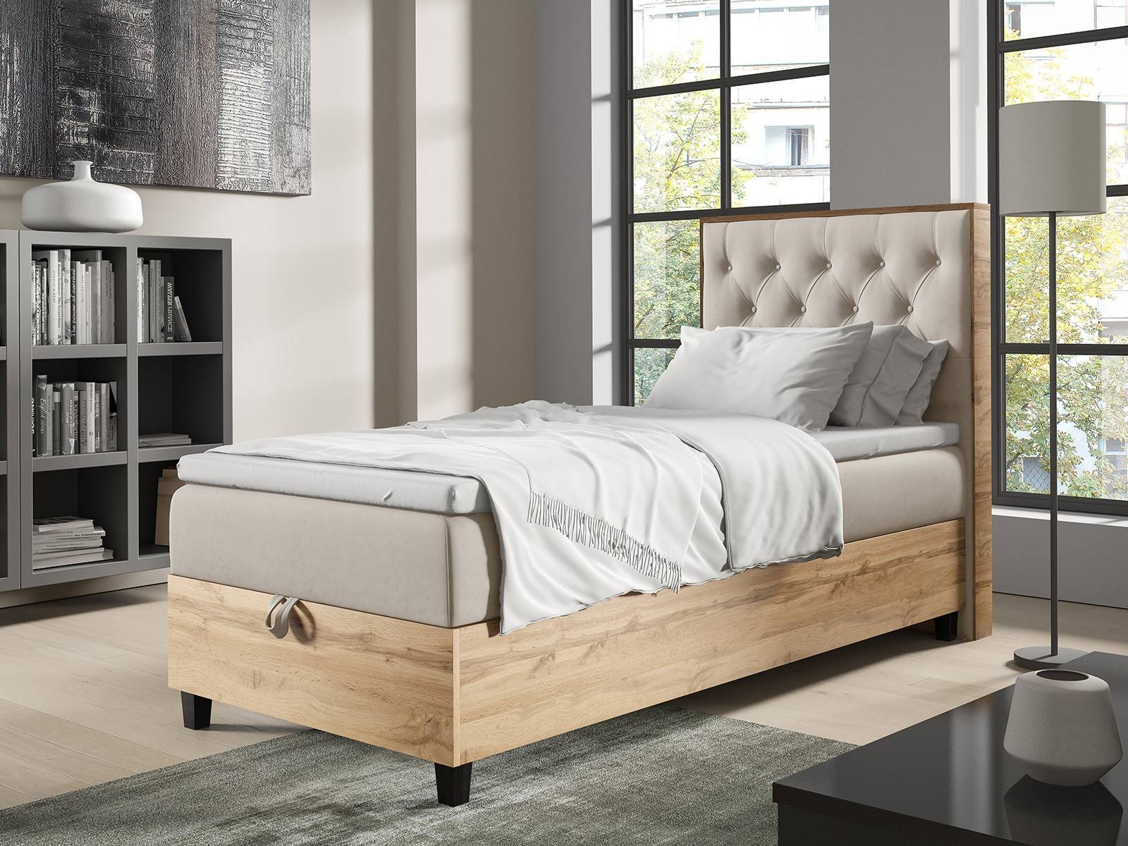 Jednoosobowe łóżko 100x200 z płyty laminowanej dąb wotan Chesterfield w komplecie z topperem