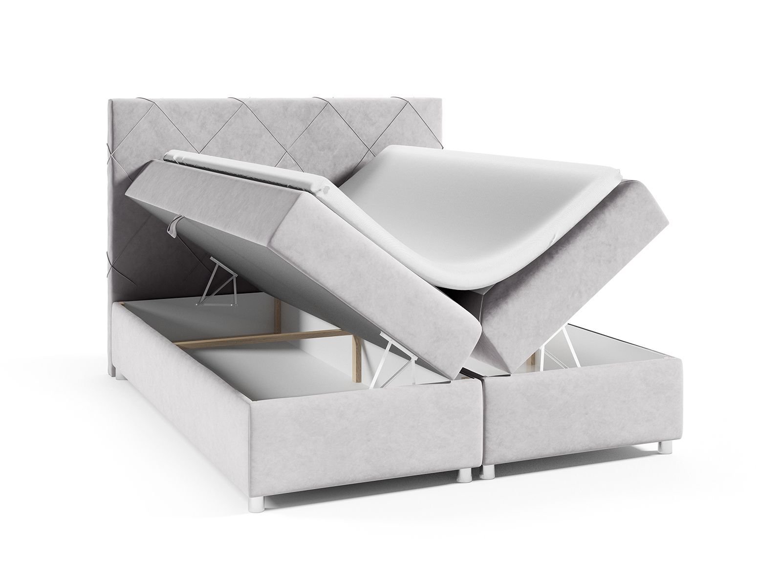 Dwuosobowe łóżko kontynentalne posiada wbudowany materac bonellowy zapewnia optymalne podparcie ciała, umożliwiając zdrowy i komfortowy sen. Łóżko z podwójnym pojemnikiem na pościel pozwala na wygodne przechowywanie, pomagając utrzymać porządek w sypialni. Ręcznie szyte, miękkie wezgłowie ozdobione poziomymi przeszyciami gwarantuje wygodne oparcie podczas czytania czy oglądania telewizji. Stabilna konstrukcja, rama z solidnego drewna oraz laminowanej płyty zapewniają trwałość na lata. Tkanina antypoślizgowa ANTI-SLIP zapobiega przesuwaniu się materaca, zwiększając komfort użytkowania.
