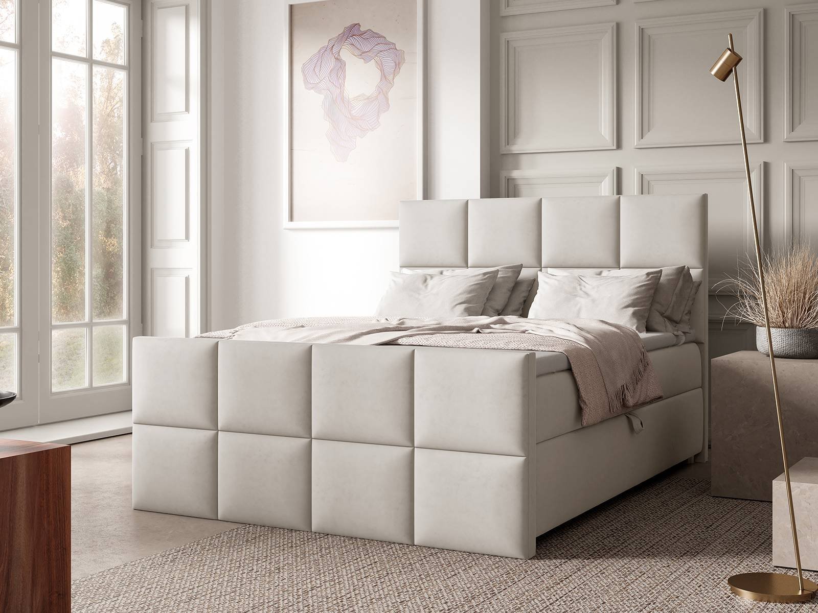 Dwuosobowe łóżko kontynentalne posiada wbudowany materac bonellowy zapewnia optymalne podparcie ciała, umożliwiając zdrowy i komfortowy sen. Łóżko z podwójnym pojemnikiem na pościel pozwala na wygodne przechowywanie, pomagając utrzymać porządek w sypialni. Ręcznie szyte, miękkie wezgłowie i przedni panel ozdobione poziomymi przeszyciami gwarantuje wygodne oparcie podczas czytania czy oglądania telewizji. Stabilna konstrukcja, rama z solidnego drewna oraz laminowanej płyty zapewniają trwałość na lata. Tkanina antypoślizgowa ANTI-SLIP zapobiega przesuwaniu się materaca, zwiększając komfort użytkowania.